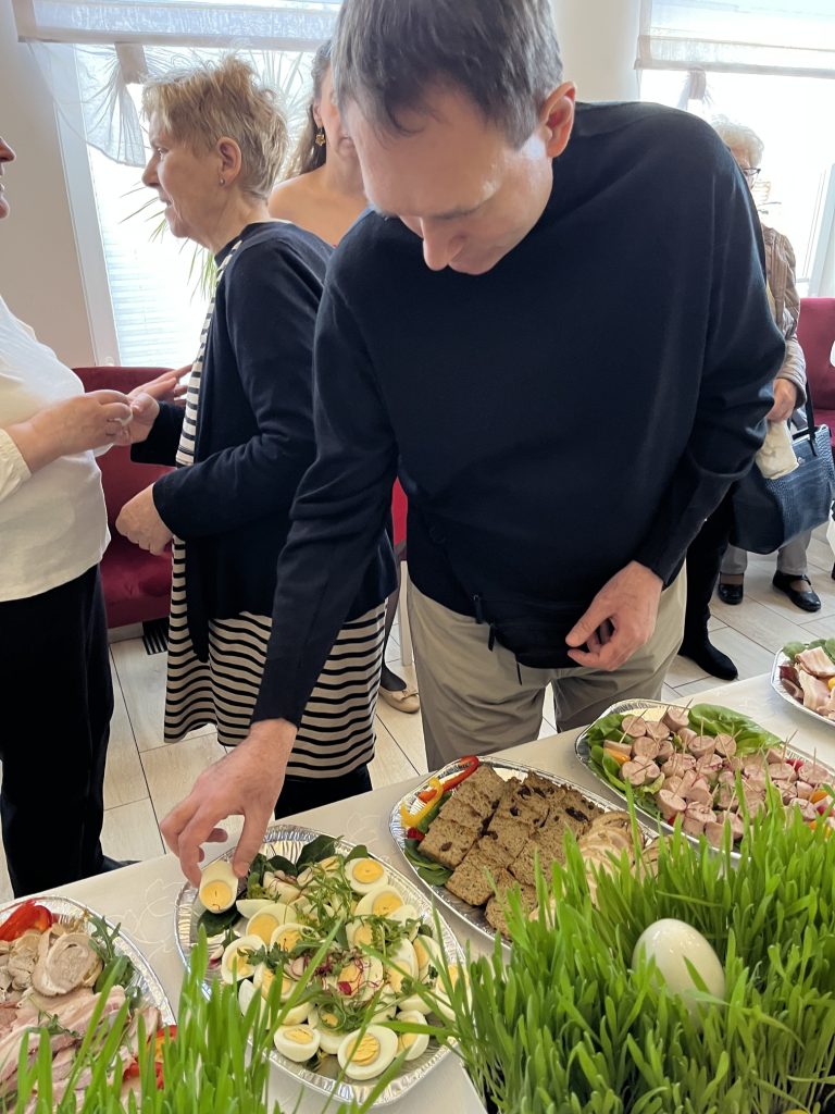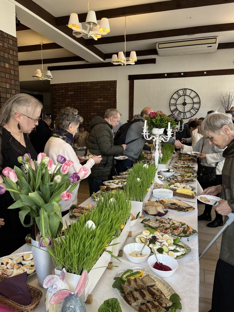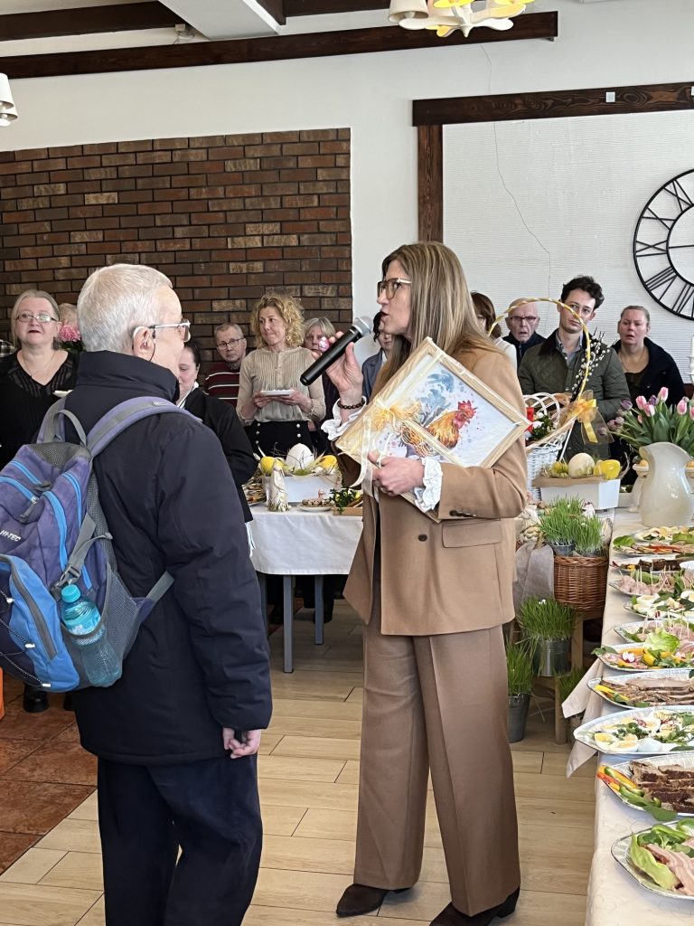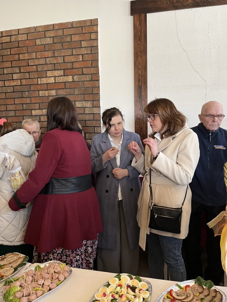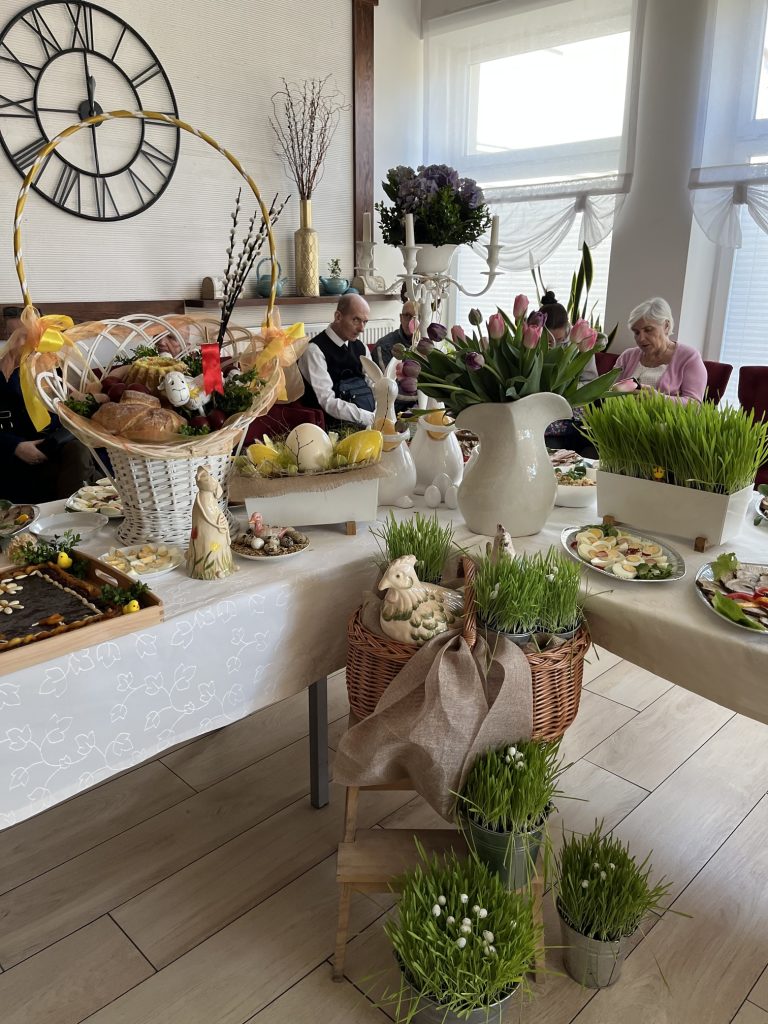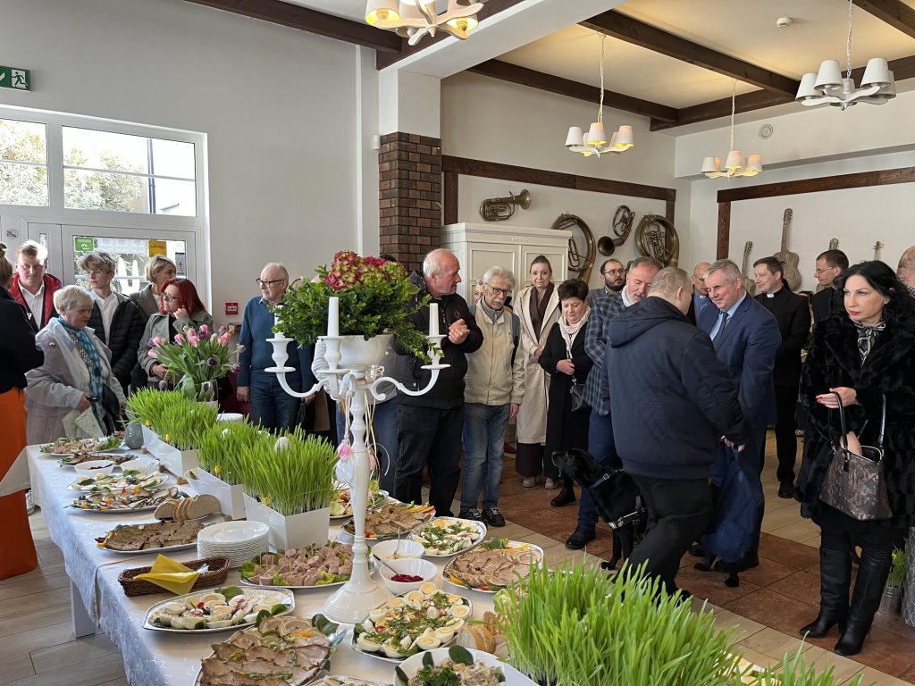 Wspólne spotkanie rozpoczęło się od serdecznego powitania uczestników przez Prezes Towarzystwa Przyjaciół Niepełnosprawnych Panią Agnieszkę Niedźwiedzką. Był też czas na życzenia, podziękowania, wspólną modlitwę oraz poświęcenie pokarmów. Na zakończenie spotkania wszyscy zasiedliśmy do wspólnego wielkanocnego poczęstunku, przygotowanego przez Zakład Aktywności Zawodowej „Zdrowa Kuchnia” TPN oraz Środowiskowy Dom Samopomocy „Sami Swoi”. Na świątecznym stole nie zabrakło tradycyjnych potraw — żurku, białej kiełbasy, jajek oraz pysznej babki, które dopełniły ten wyjątkowy czas spędzony razem.