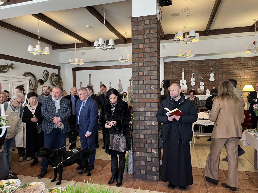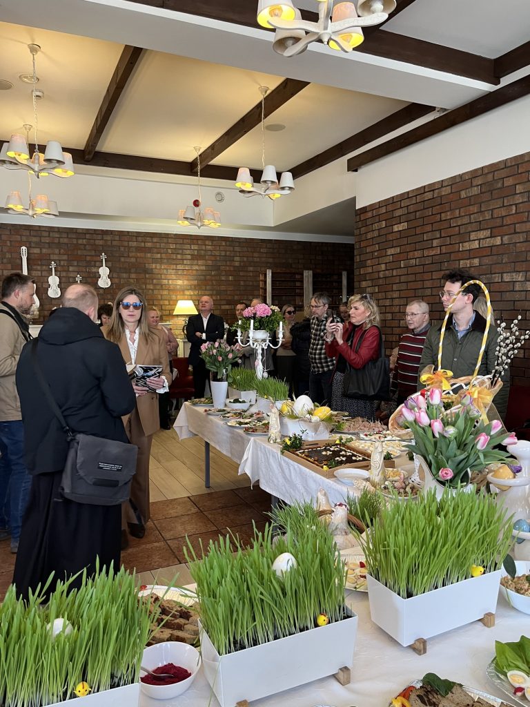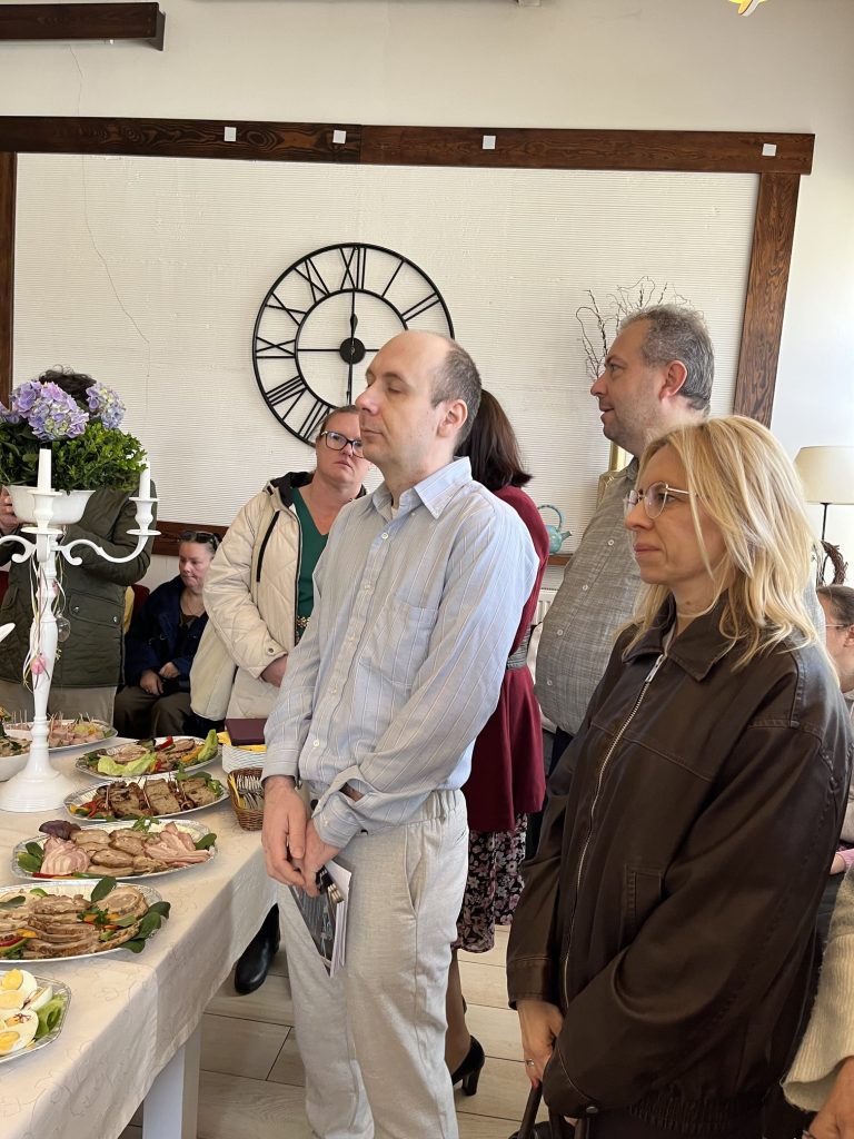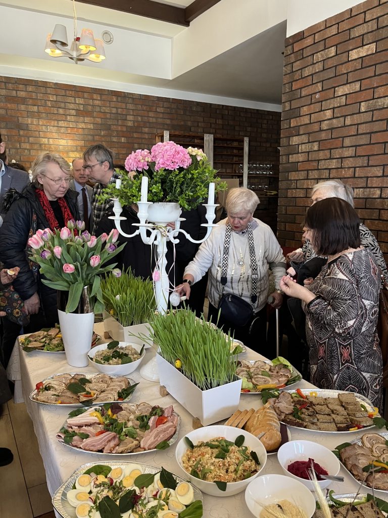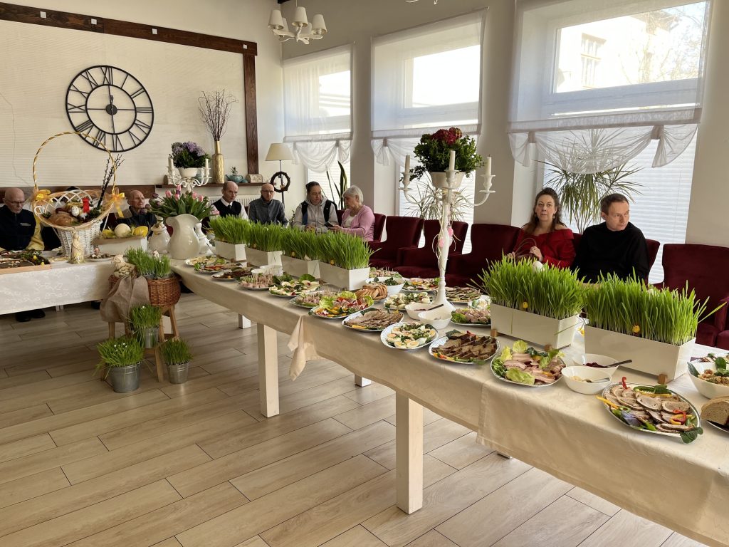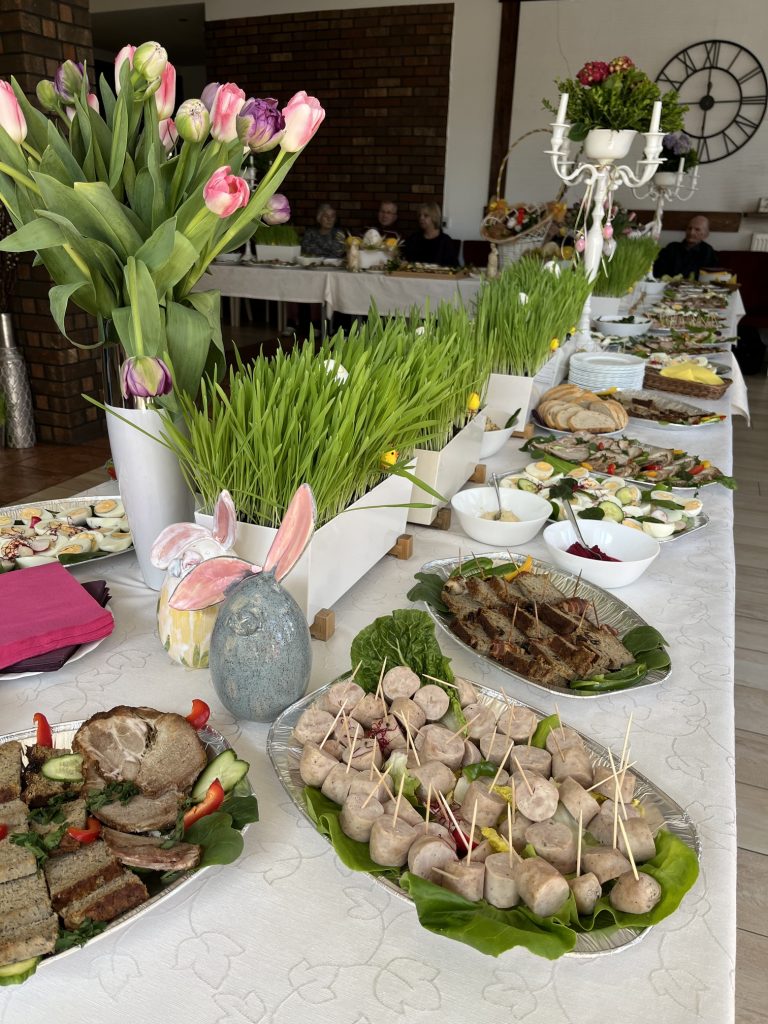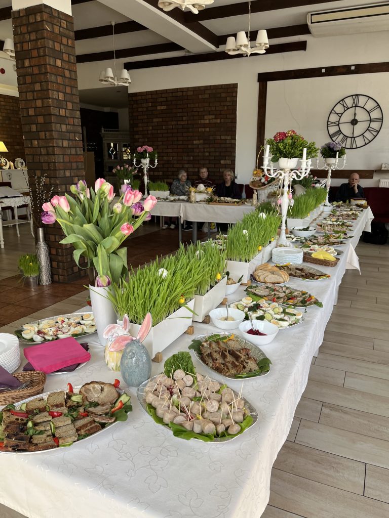 Wspólne spotkanie rozpoczęło się od serdecznego powitania uczestników przez Prezes Towarzystwa Przyjaciół Niepełnosprawnych Panią Agnieszkę Niedźwiedzką. Był też czas na życzenia, podziękowania, wspólną modlitwę oraz poświęcenie pokarmów. Na zakończenie spotkania wszyscy zasiedliśmy do wspólnego wielkanocnego poczęstunku, przygotowanego przez Zakład Aktywności Zawodowej „Zdrowa Kuchnia” TPN oraz Środowiskowy Dom Samopomocy „Sami Swoi”. Na świątecznym stole nie zabrakło tradycyjnych potraw — żurku, białej kiełbasy, jajek oraz pysznej babki, które dopełniły ten wyjątkowy czas spędzony razem.